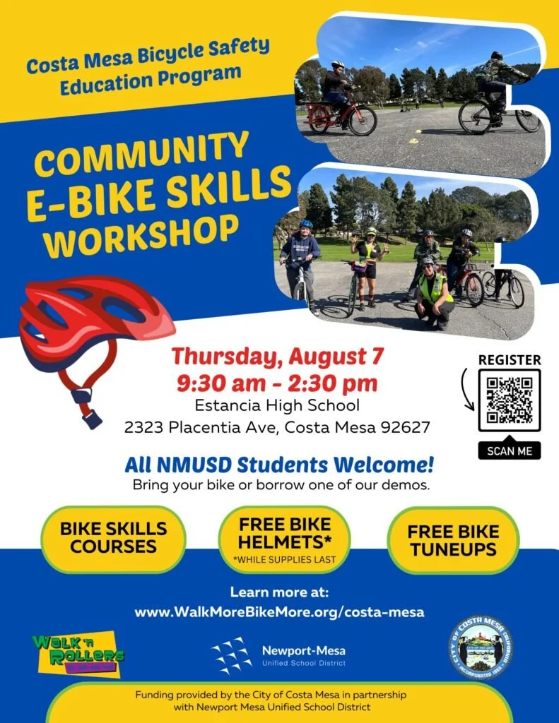 The City has heard the concerns about e-bikes and we are proud to report they are doing something about the problem. On August 7 from 9:30am to 2:30pm at Estancia High School, the city will be hosting a FREE e-bike skills workshop for kids of all ages to learn to ride their bikes safely to school and in their community. Participants will receive a free bike helmet* and free bike tune-ups!
