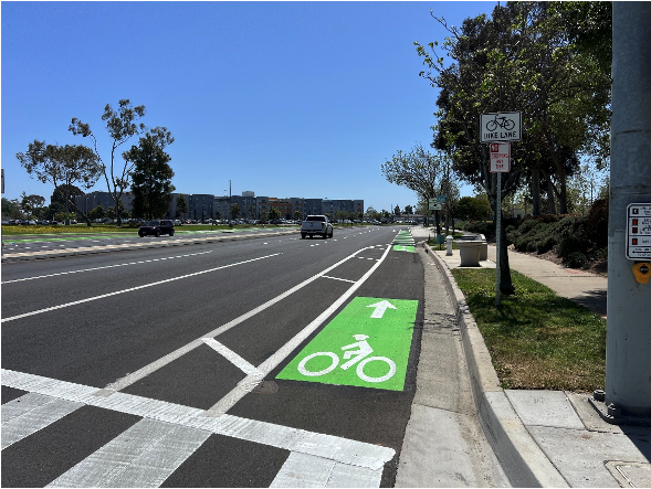 According to the City, the project includes new pavement (slurry seal), separated cycle track bikeways, traffic signal modifications, green bike conflict markings, new street lighting, and updates to median landscaping and irrigation. The separated bikeways are designed to connect with the recently completed improvements at Adams Avenue and Pinecreek Drive, creating a continuous bikeway between Harbor and Fairview!